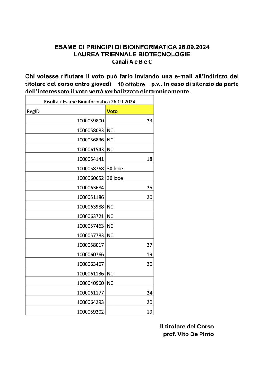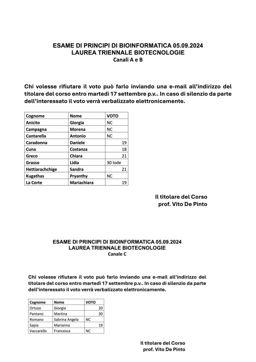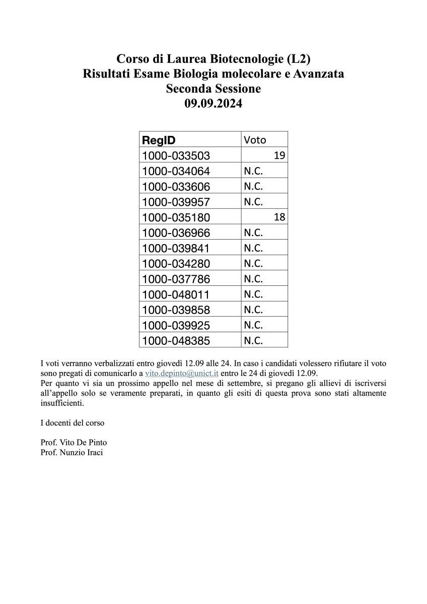 Si avvisano gli studenti prenotati che gli esami relativi a questo appello si svolgeranno giovedì 19 e venerdì 20 Settembre p.v. (in base al numero di studenti che si presenteranno), invece che il 16 settembre a causa di sovrapposizioni con altri impegni istituzionali.