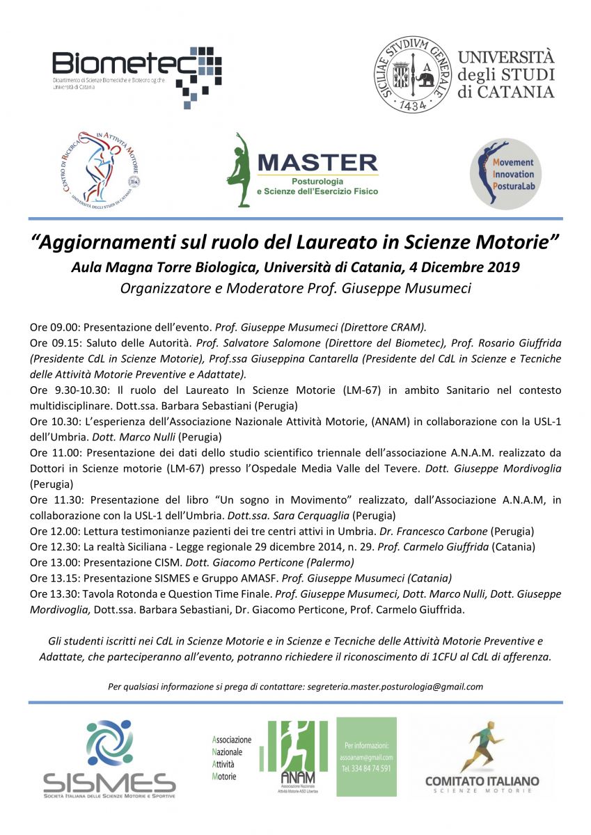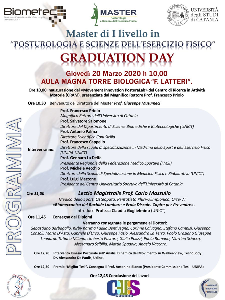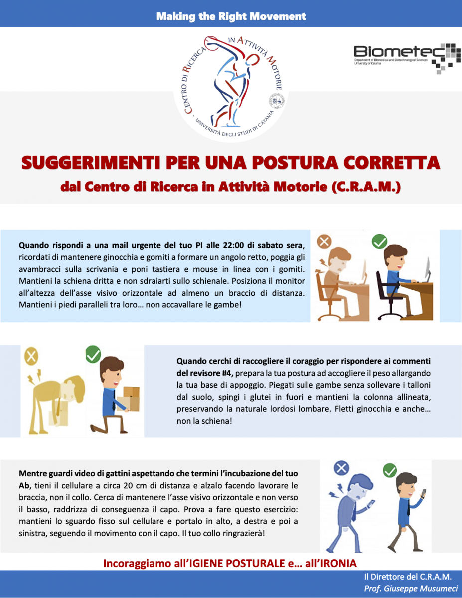 CHECK-UP POSTURALE Il Centro Di Ricerca In Attività Motorie (C.R.A.M.) del BIOMETEC, nell’ambito della promozione della salute e della prevenzione delle patologie muscoloscheletriche, offre la possibilità di eseguire gratuitamente un’analisi posturale presso il Laboratorio di Analisi del Movimento, Torre Nord, 7° Piano. |