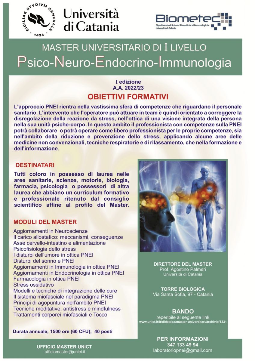Sono aperte fino al 14 novembre 2022 le iscrizioni al master di 1° livello in "Psico-Neuro-Endocrino-Immunologia (PNEI)", per l'a.a. 2022/2023.