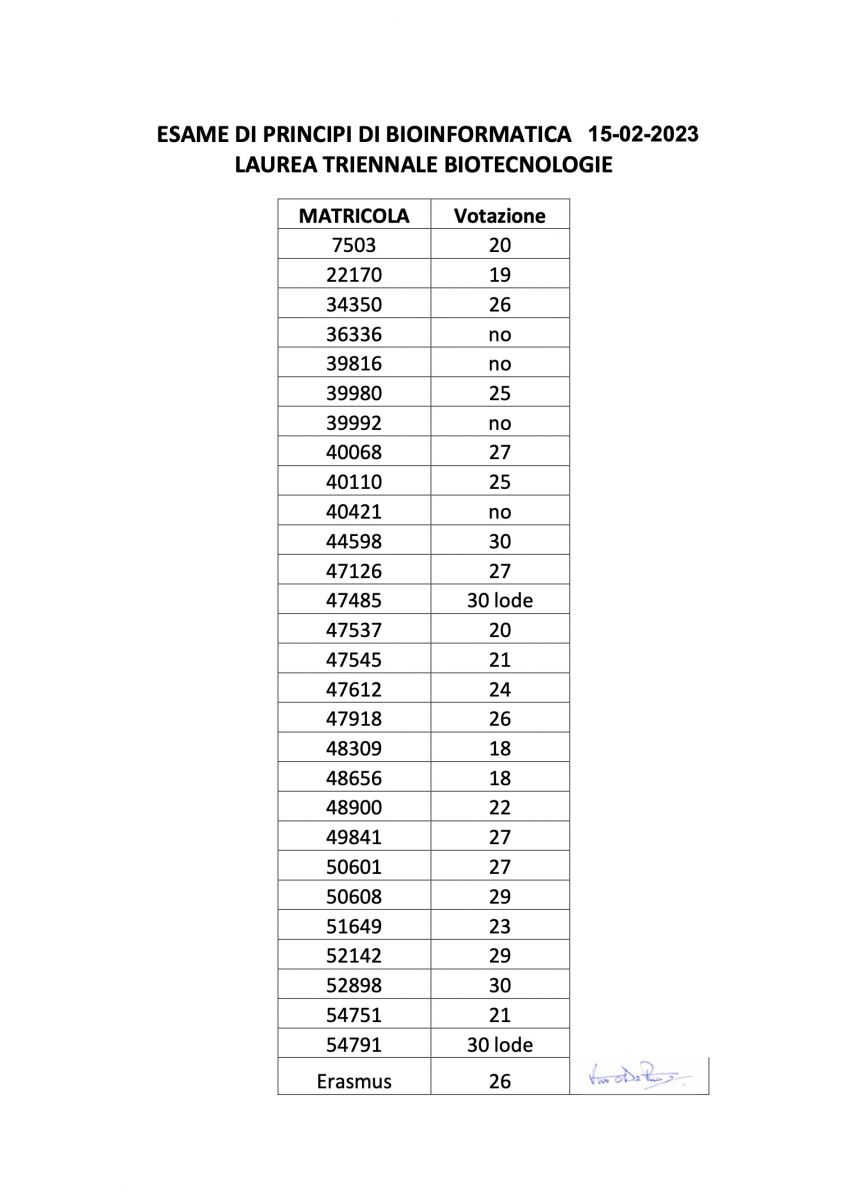 Risultati della prova scritta del 26.01.2023. A fianco al numero di matricola la votazione riportata. I risultati sono in ordine di num. di matricola.